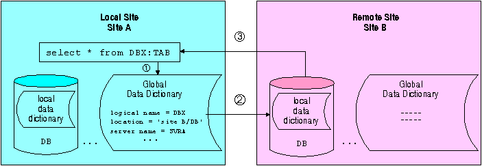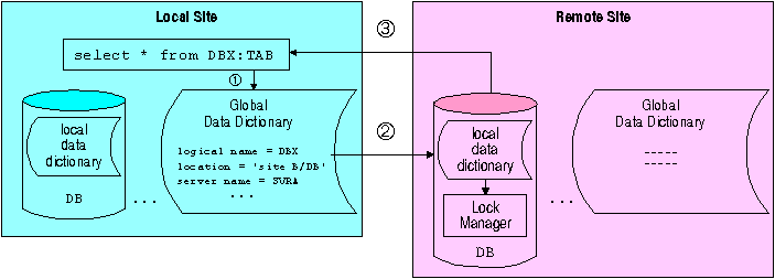 When requesting data from the remote site, Empress acquires the location of the database from the Global Data Dictionary and communicates through the Empress Server to the remote site and accesses the data through the local data dictionary as illustrated in the following diagram.