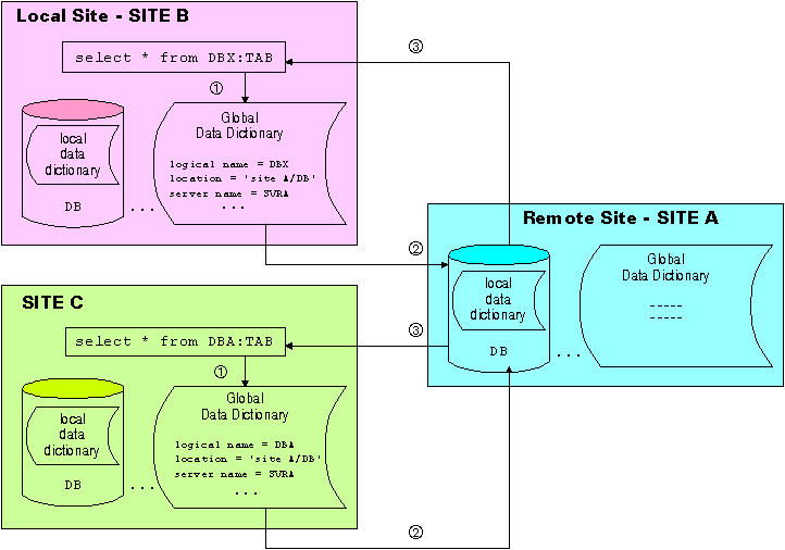 Both Site B and Site C are new additions to the network and they both happen to have a local database with the same database name of DB as the server (Site A). With Empress, not only is there no renaming required but both Site B and Site C have the freedom to choose the name they desire for the database DB at Site A (for example, DBX and DBA). As a result, users can access data anywhere on the network as if the data were on the local system and still maintain the autonomy of each site.